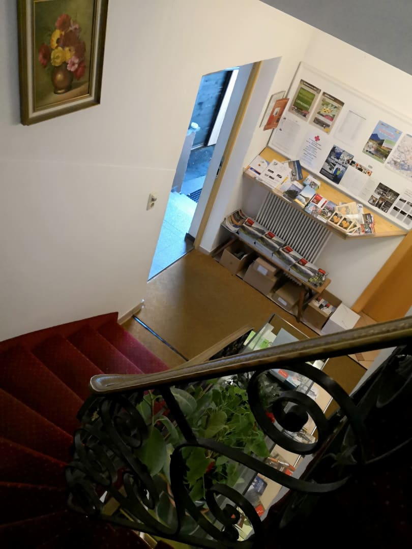 Treppenhaus mit Blick auf die Info-Auslagen in mehreren Sprachen