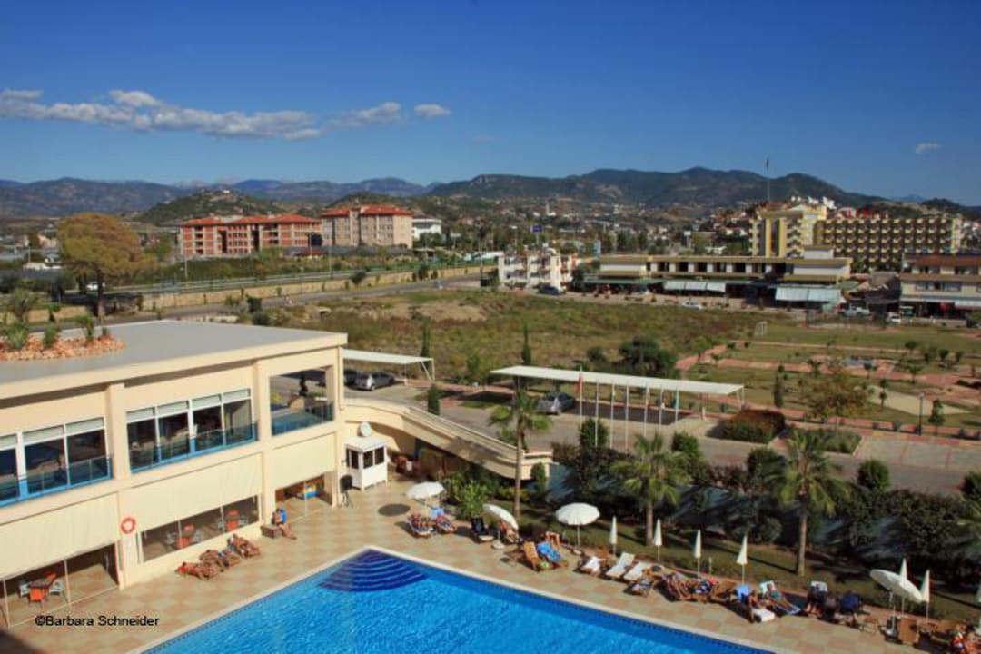 Blick auf Pool und den Eingang des Hotels