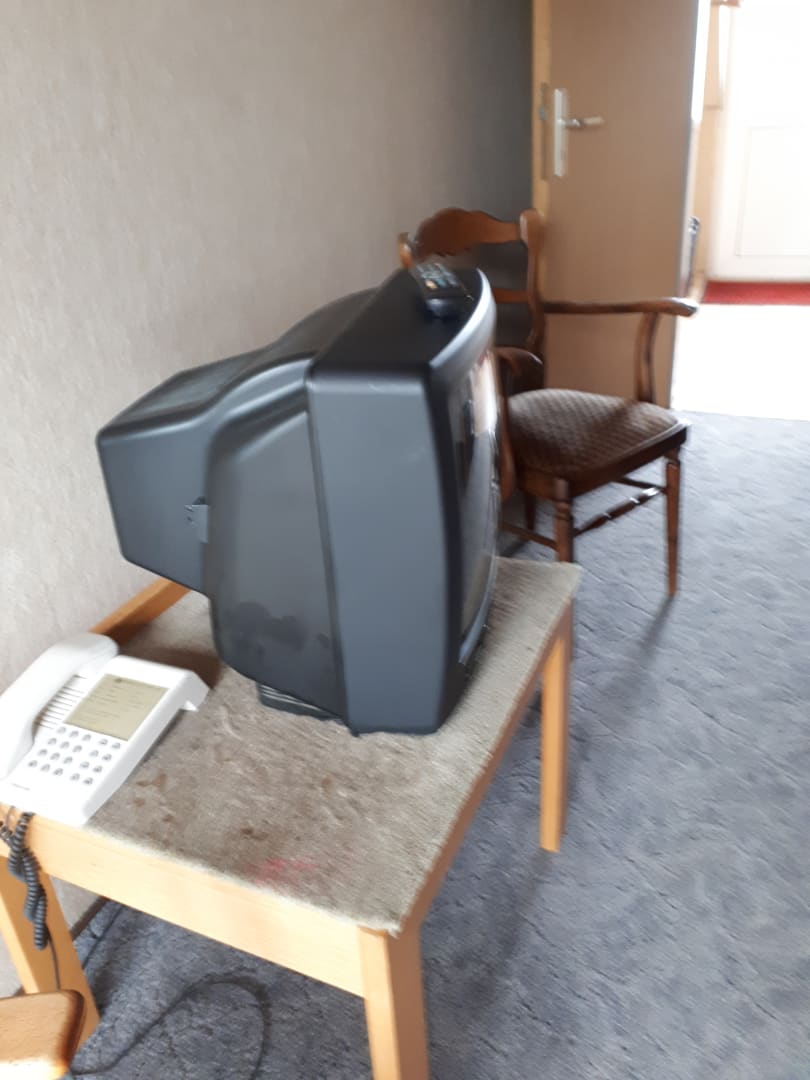 Liebevoll angerichtet. Der Röhrenfernseher auf einem Stück Teppich mit undefinierbaren Flecken.