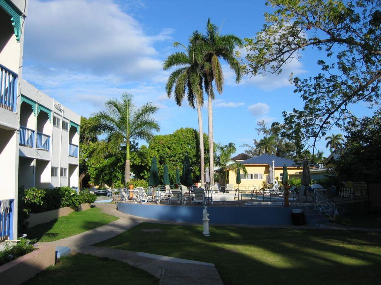 Blick auf den Pool im Garten des Toby Inn.