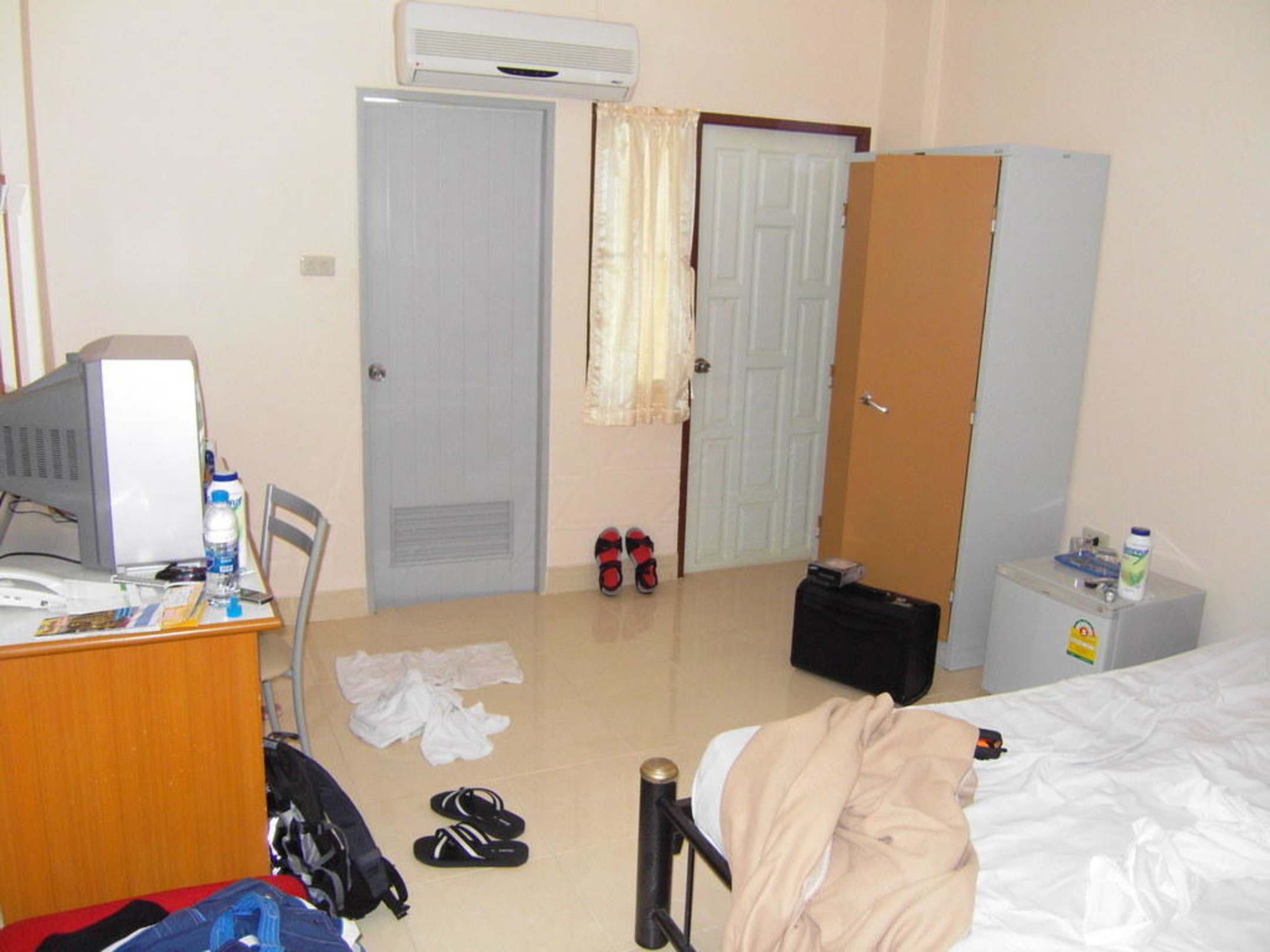 ZimmerausblickTür rechts zum Balkon links zur Toilette. Schrank Minnibar und Bett,linke Seite TV.