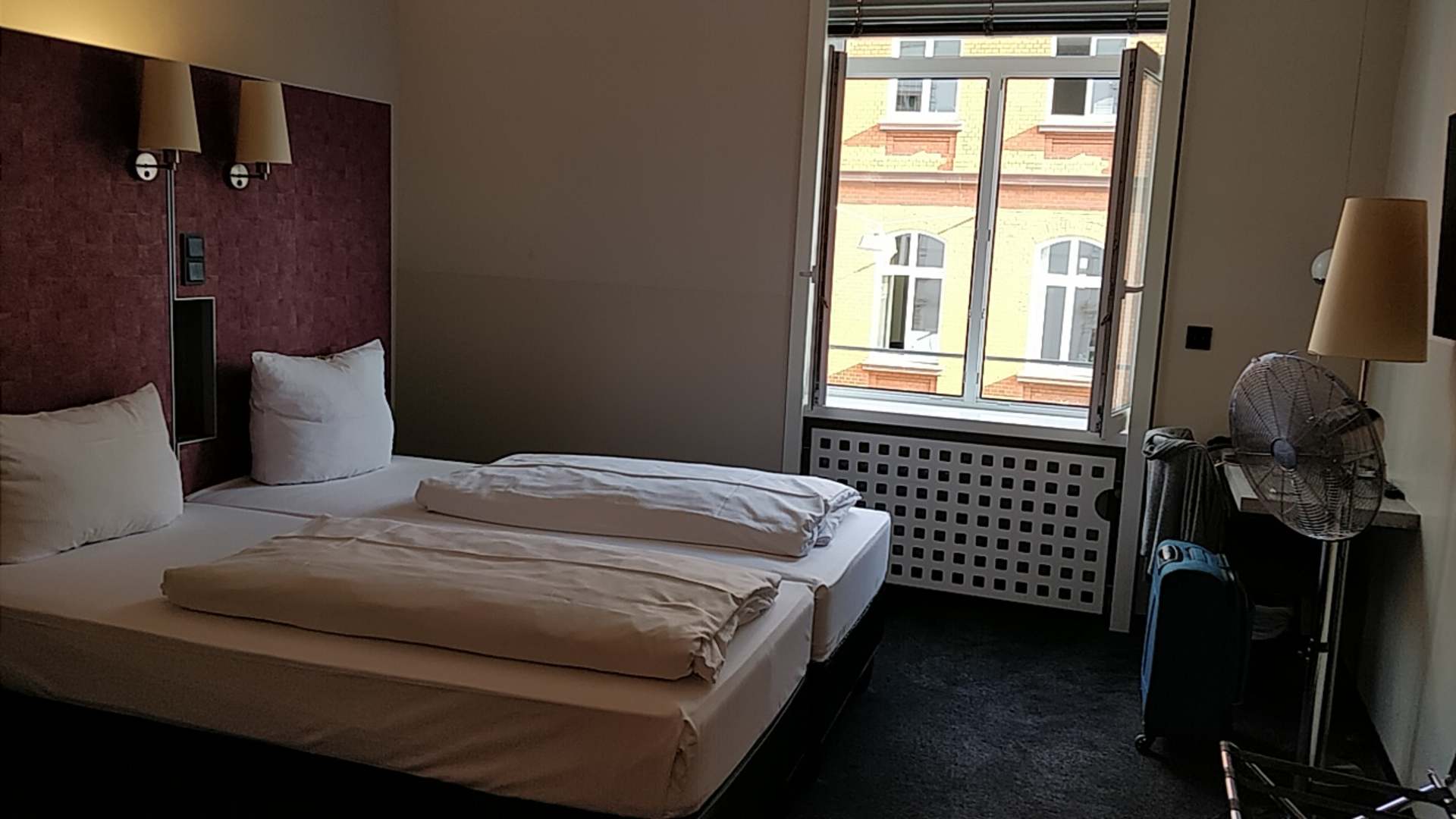 Großes geräumiges Zimmer, vor dem Bett sind noch ca 1,5 m Platz und hinter dem Bettkopf ist noch ein Regal von der einen Seite und Garderobe von der anderen Seite. Tresor und Kühlschrank sind da mit eingebaut