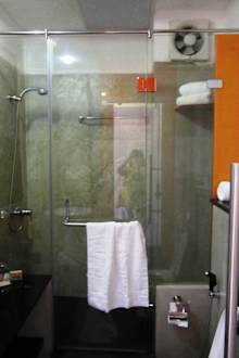 Bad, wobei die Handtücher in der Duschkabine liegen, statt außerhalb