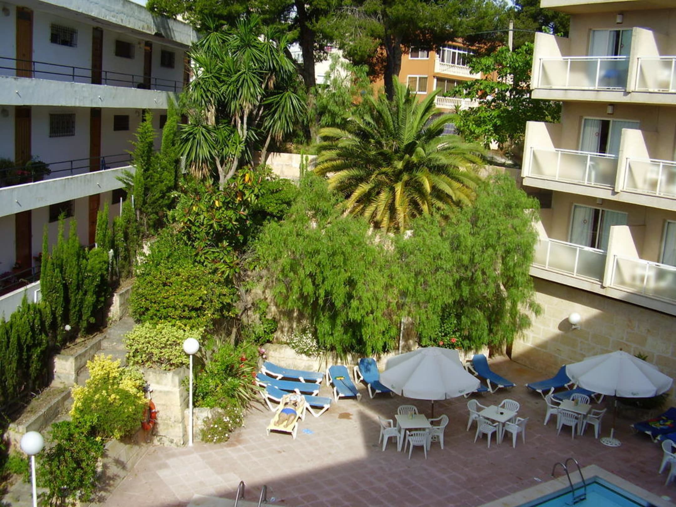 Das Foto entstand beim Blick von unserem Balkon in der zweiten Etage in den innenliegenden Poolbereich. Auf der rechten Seite sind weitere Balkons des Hotels zu erkennen, links ist ein Wohngebäude.