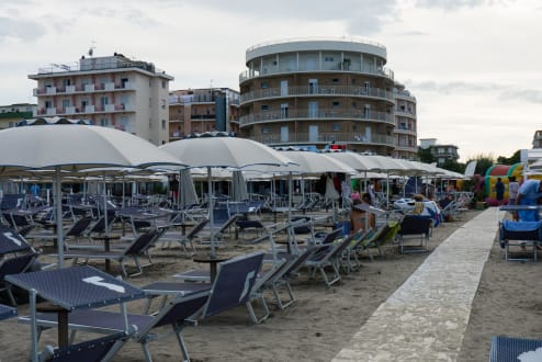 Hotel Torremaura vom Strand ausDas Hotel ist der runde Bau rechts. Fotografiert wurde vom Strand "Bagno del Pino" aus.