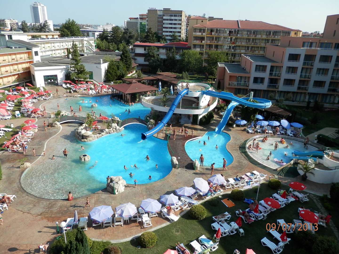 Pohled z balkónu na bazén