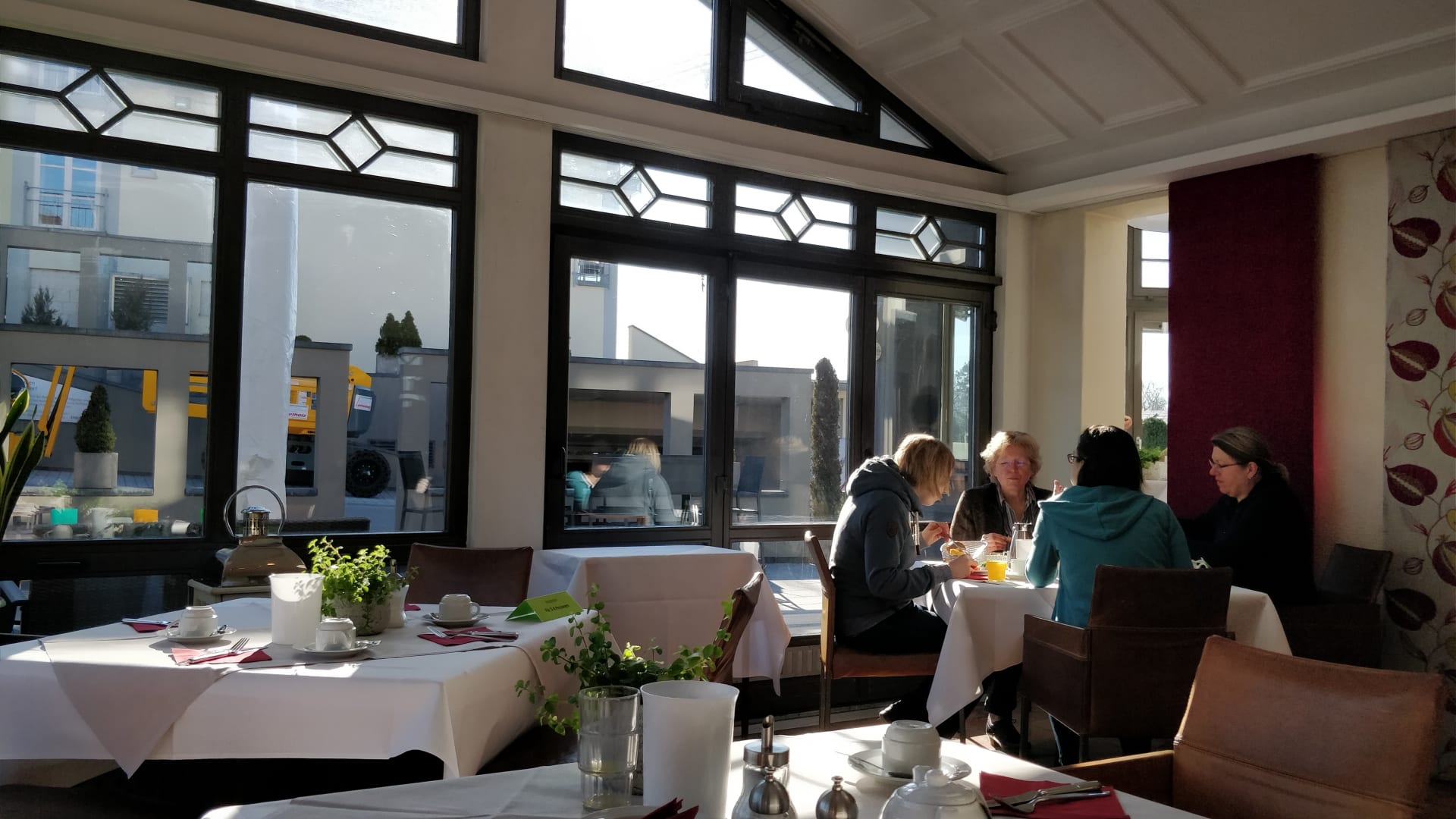 Frühstück im Wintergarten mit Blick auf die Bauarbeiten am Gästehaus gegenüber.