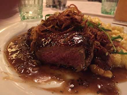 Rostbraten vom Angus-Beef mit Zwiebelsauce, gerösteten Zwiebeln und Käsespätzle / angeschnitten