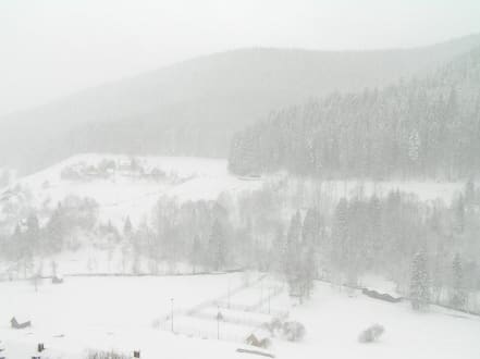 Hier die Aussicht vom Balkon auf den mit Schnee bedeckten Schwarzwald.