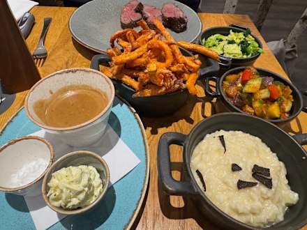 Chateaubriand mit Kräuterbutter, Pfeffersauce, sautiertem Wirsing, Pfannengemüse und getrüffeltem Risotto