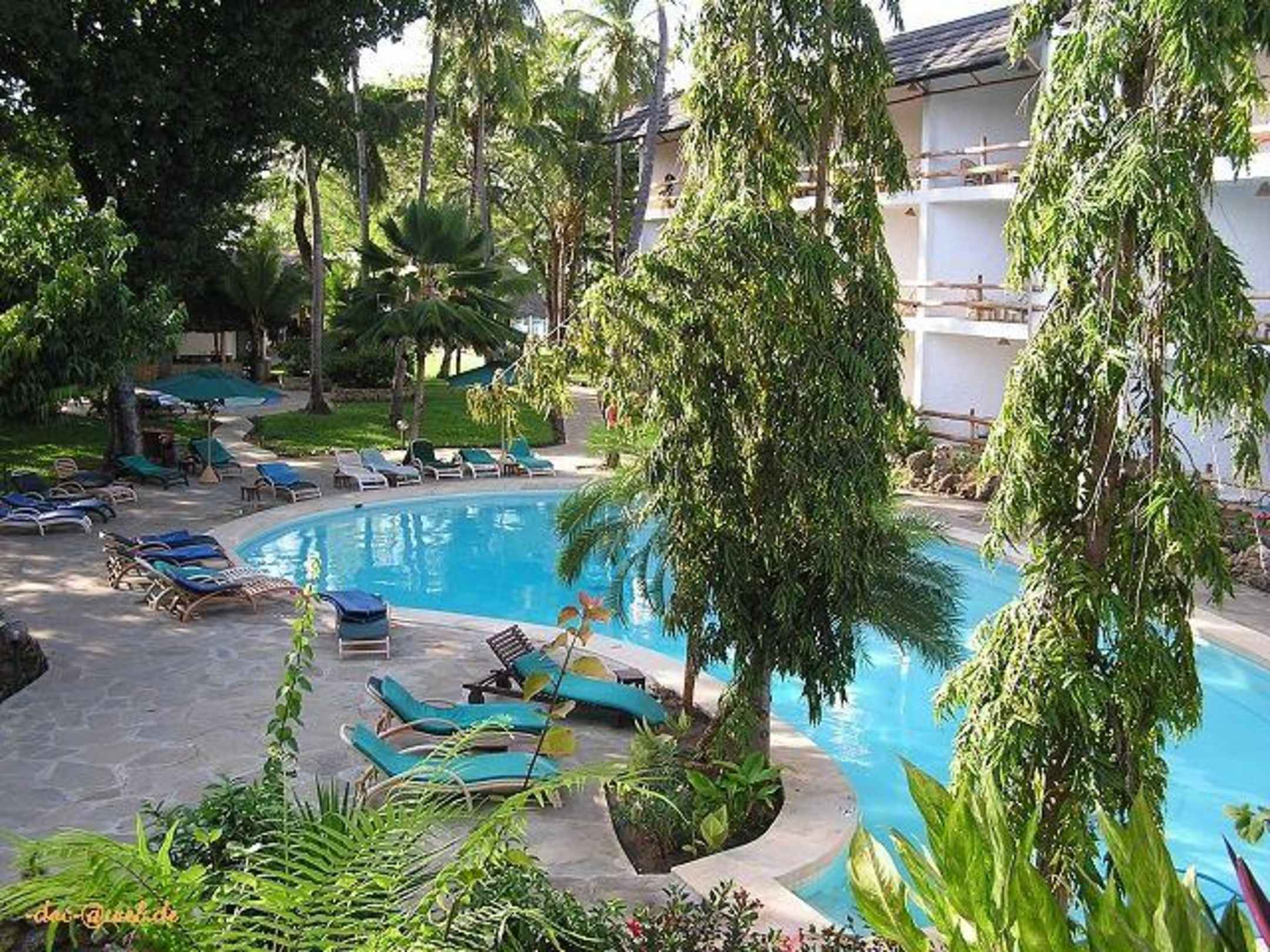 Blick vom Speisesaal auf den mittleren Pool