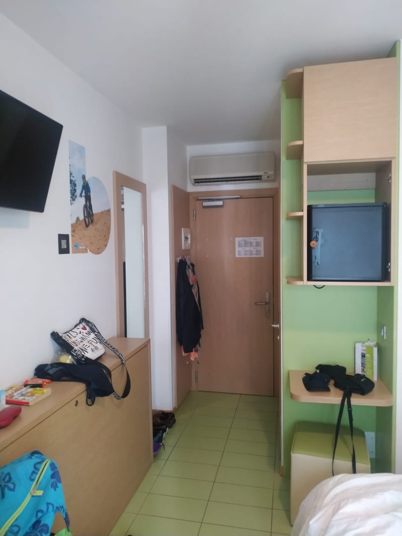 Blick v.Fenster zur Türe,Kühlschrank re.oben,Hocker