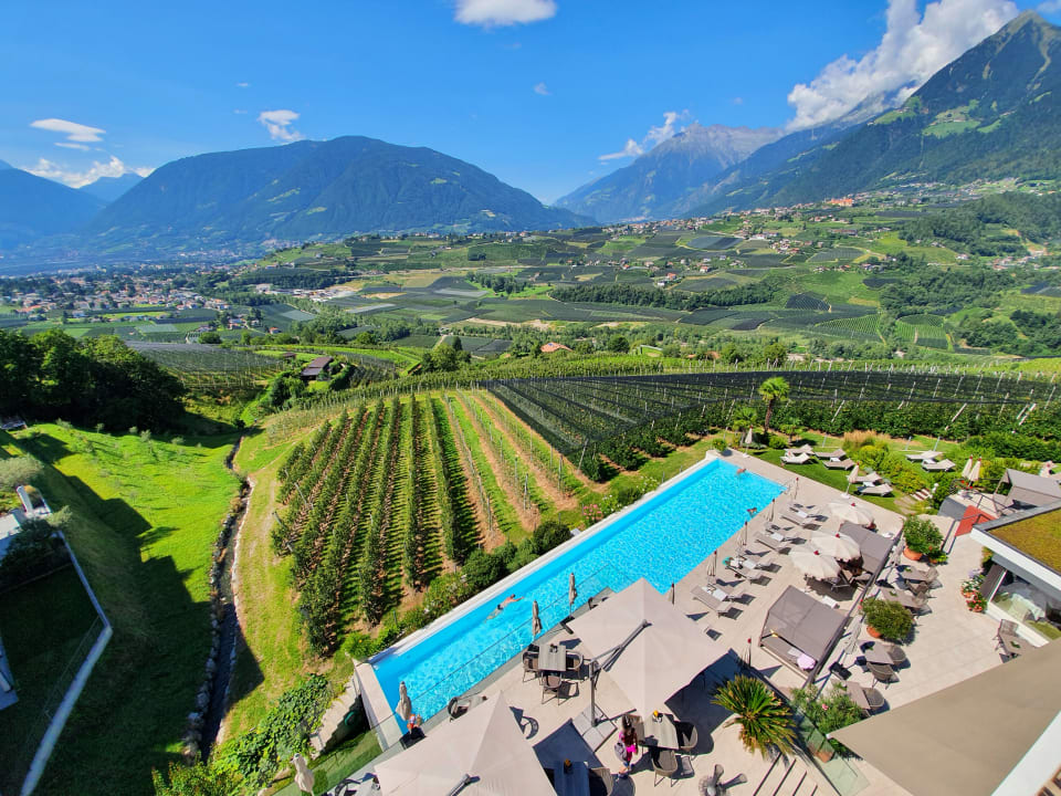 Blick von oben auf Terrasse und Außenpool