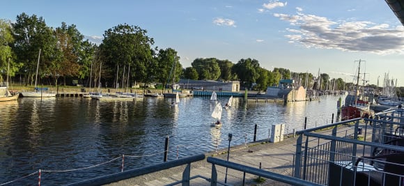 Blick vom Balkon des Maisonette-Zimmers auf die Hafenausfahrt