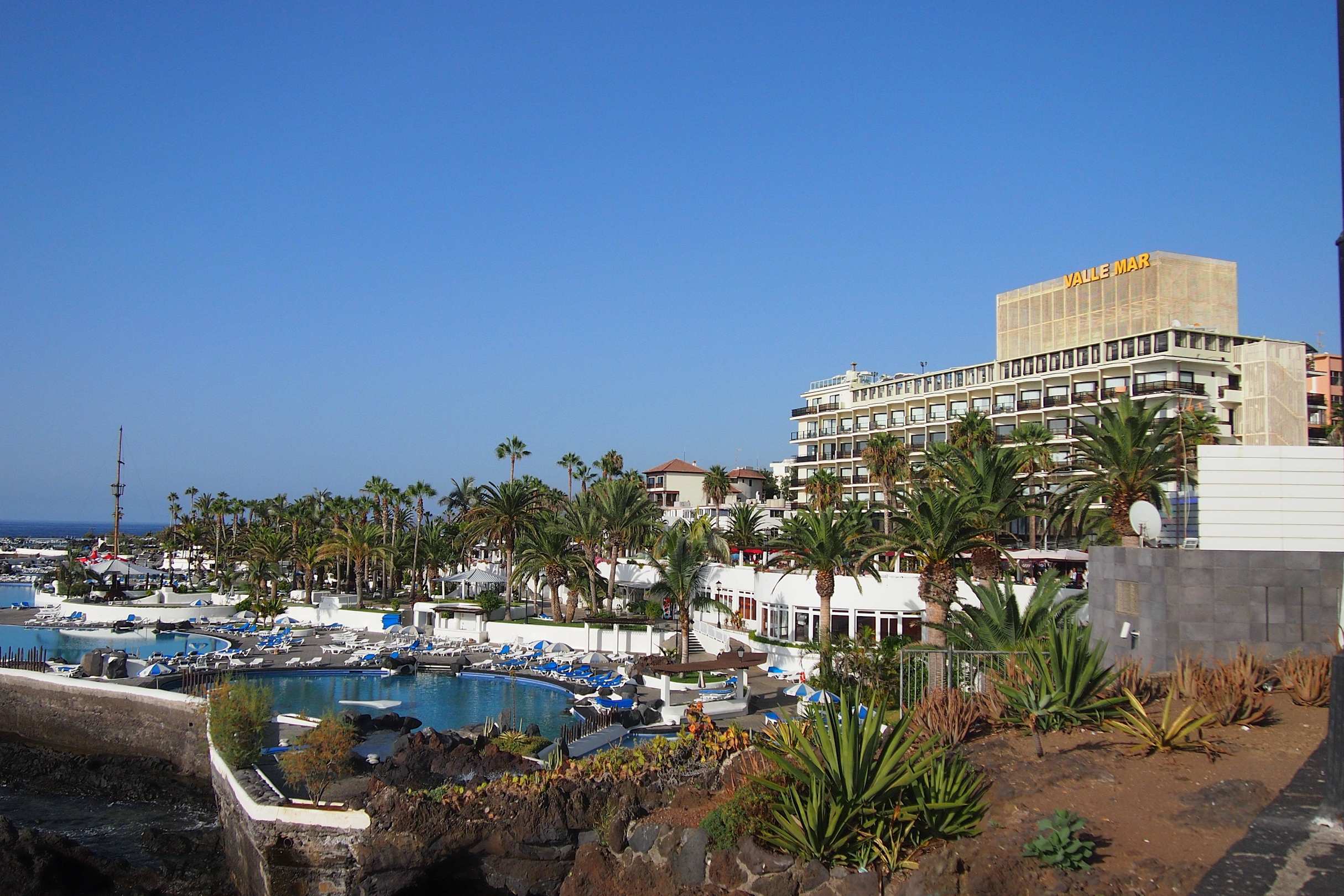 Blick über die Meerwasserschwimmbecken aufs Hotel