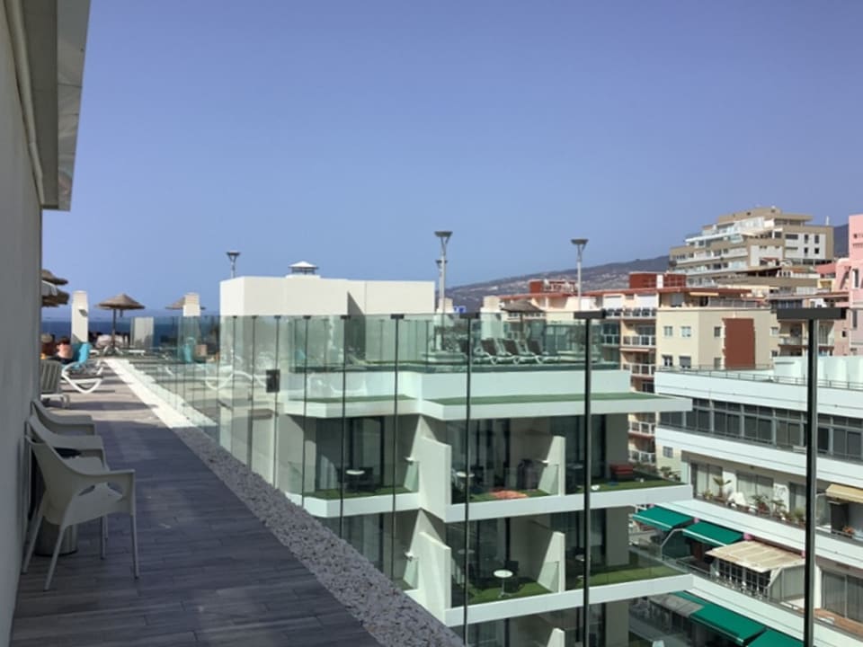 Dachterrasse hinter der Wand ist der Pool, die Zimmer rechts sind neu