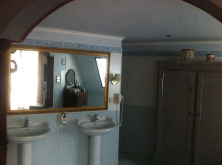 Rechts neben dem Spiegel gehts zur Dusche, links z