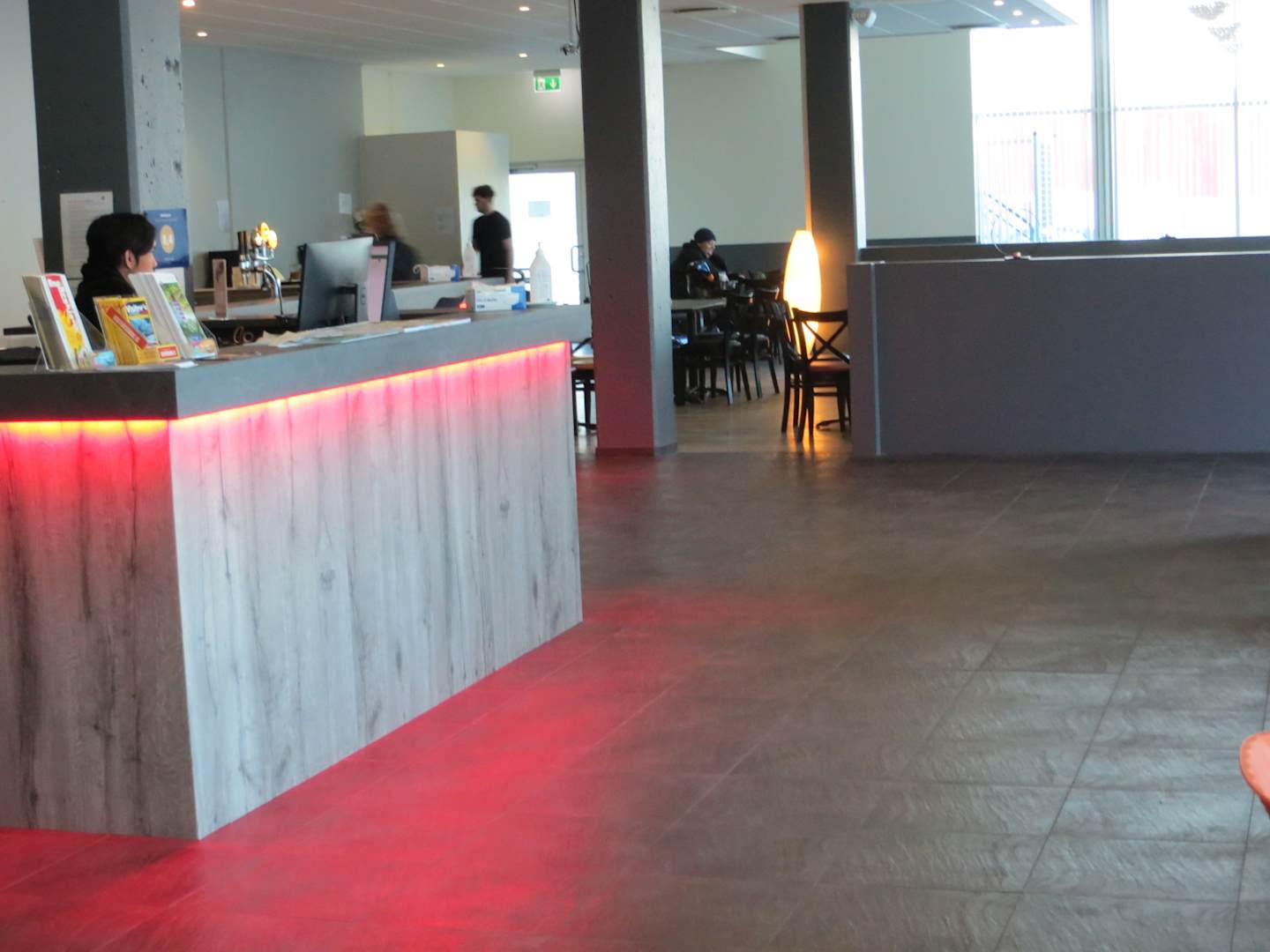 Rezeption, im Hintergrund Gastrobereich
