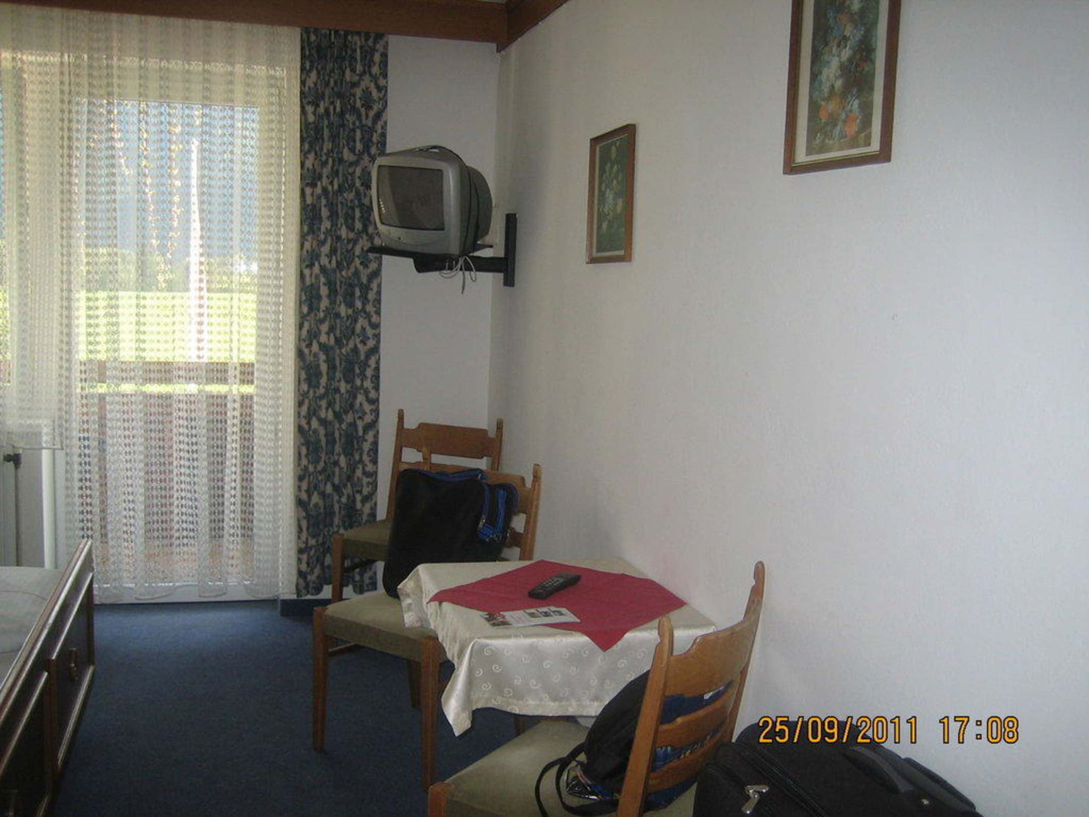 BalkontürBlick vom Eingang des Doppelzimmers mit Sitzgruppe, sehr kleinem Fernseher und Ausgang Balkon im Hintergrund
