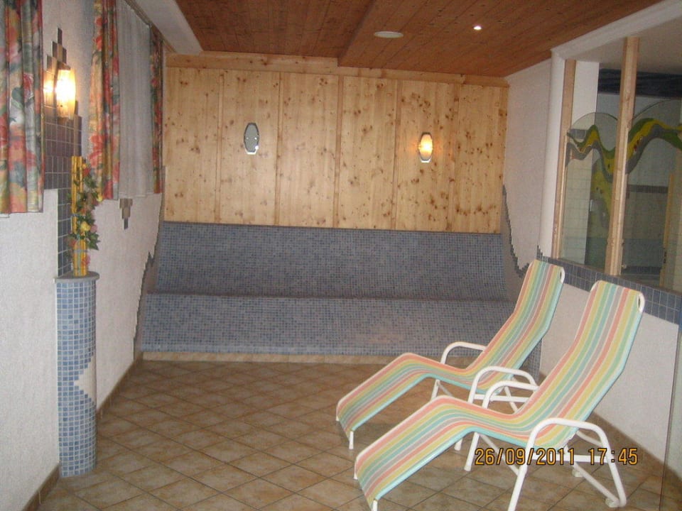Ruheraum im Saunabereich hinter Glasfront mit Wärmebank im Hintergrund