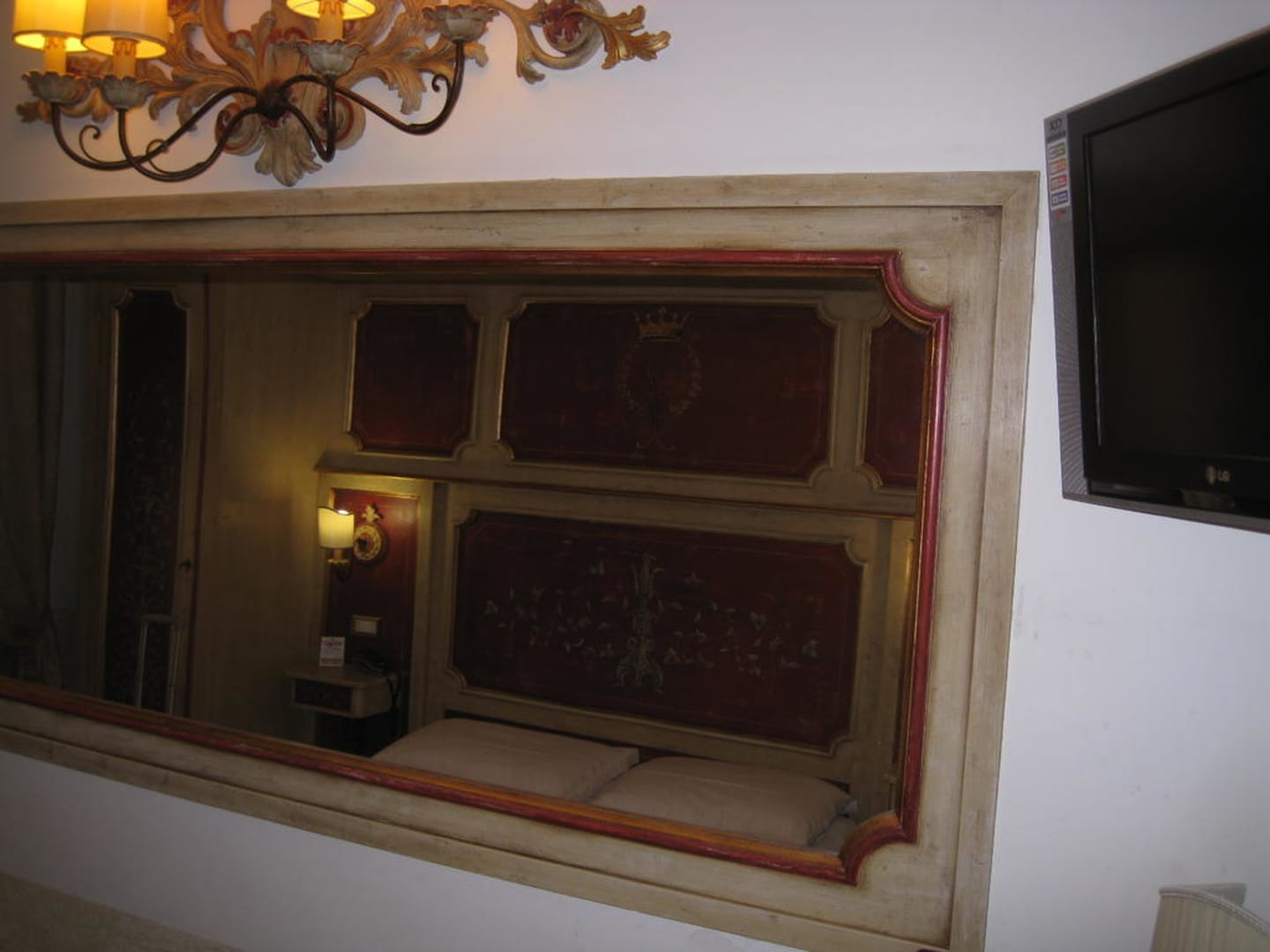 Zimmer mit großem Spiegel gegenüber dem Bett und TV an der Wand rechts