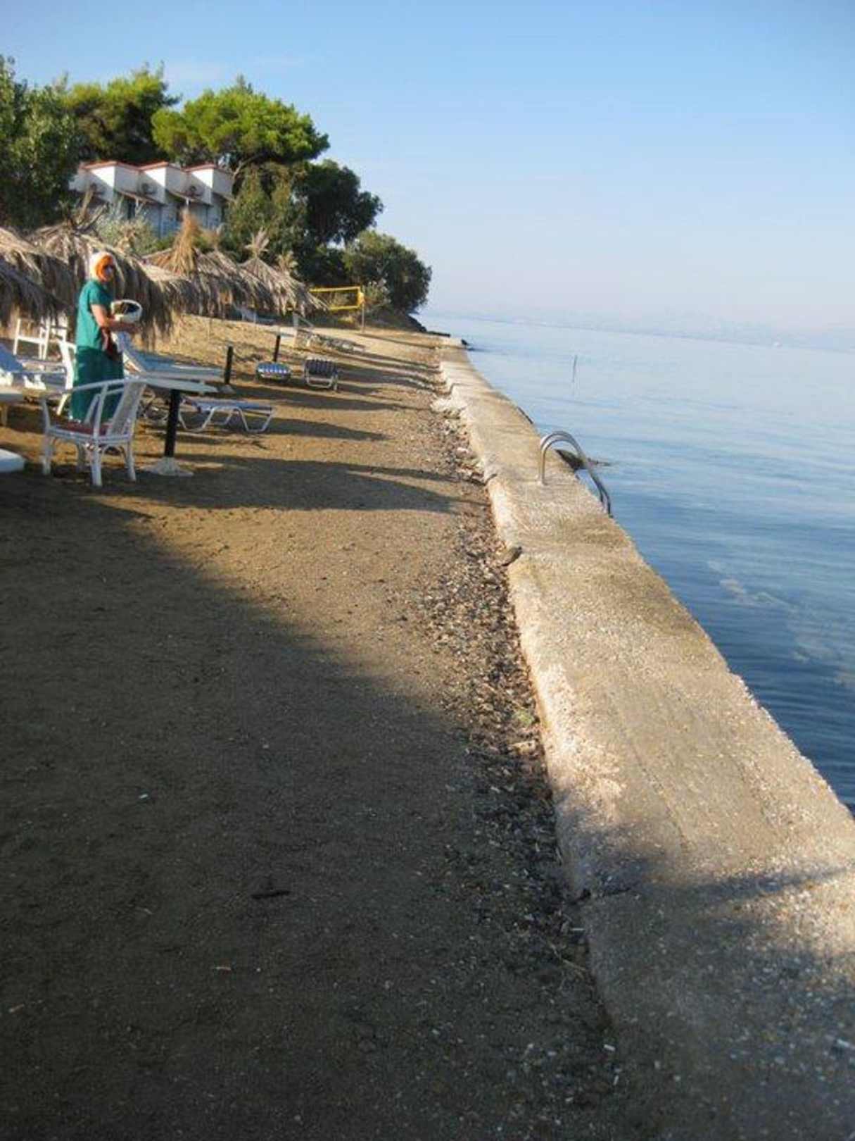 Der TraumstrandUngepflegter, steinharter und abschüssiger Kies-/Sandstrand. Hinter der maroden Mauer glasklares Wasser aber leider tausende Seeigel
