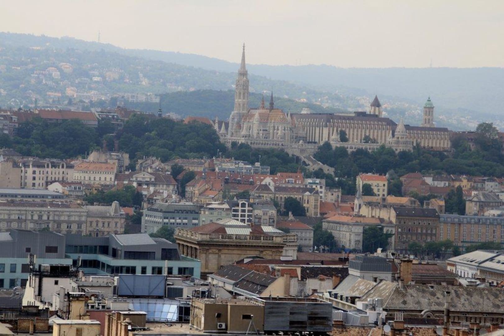 In der Bildmitte erkennt man das Hotel, darüber das Burgviertel, dahinter die Budaer Berge. In Blickrichtung zwischen den Häusern vorm Hotel und dem Hotel ist die Donau, die man nicht sieht.