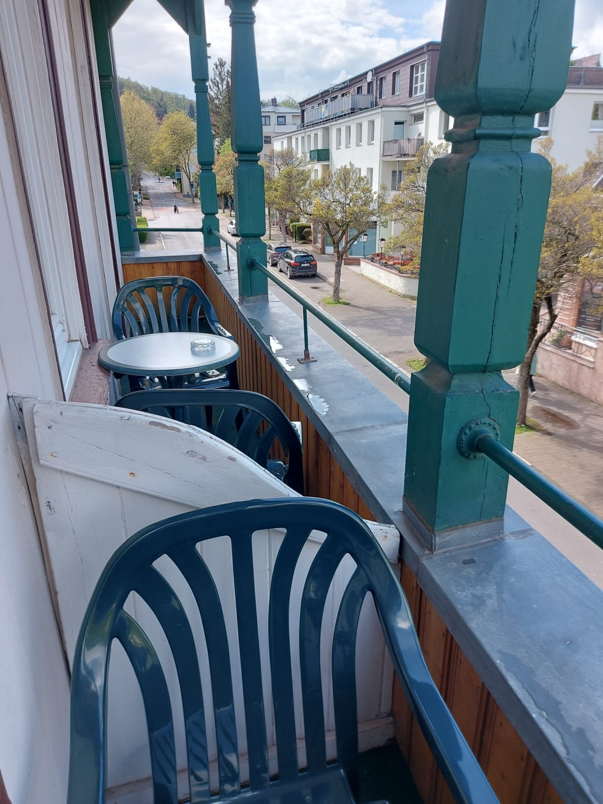 Der möblierte Nachbarbalkon; zwei Stühle, ein Tisch und ein Aschenbecher sind Standart.