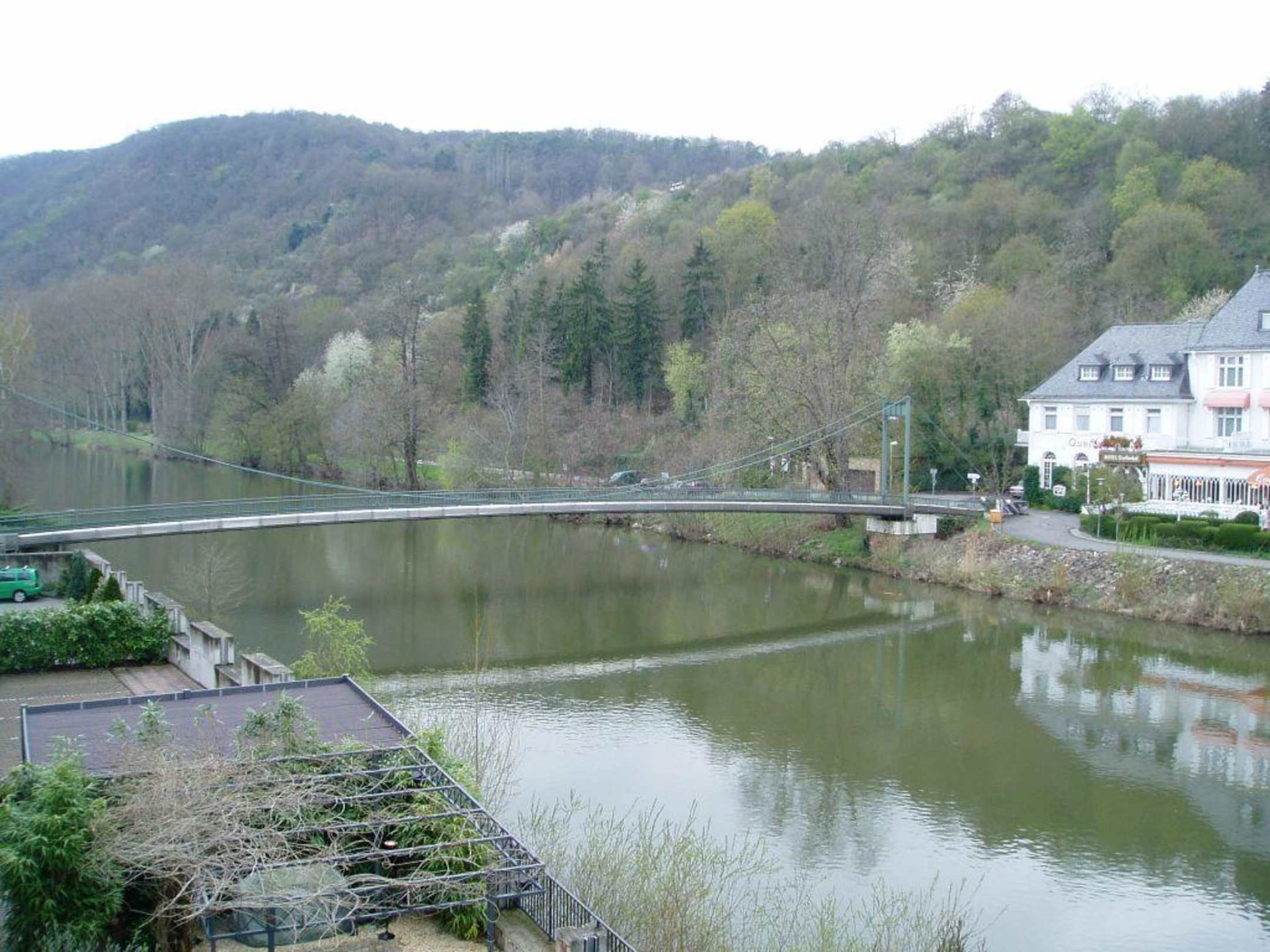 AusblickDer Ausblick vom Zimmer des Hotel Victoria in Bad Kreuznach mit Blick auf die Nahe mit Fussgängerbrücke und Wald.