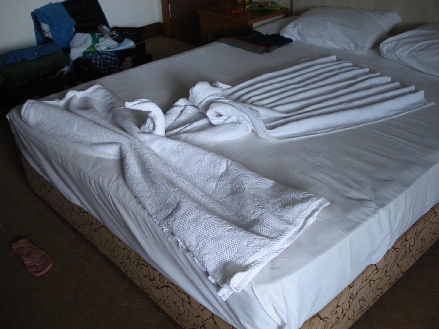 eine kleine Skulptur auf dem Bett aus den Bettdecken