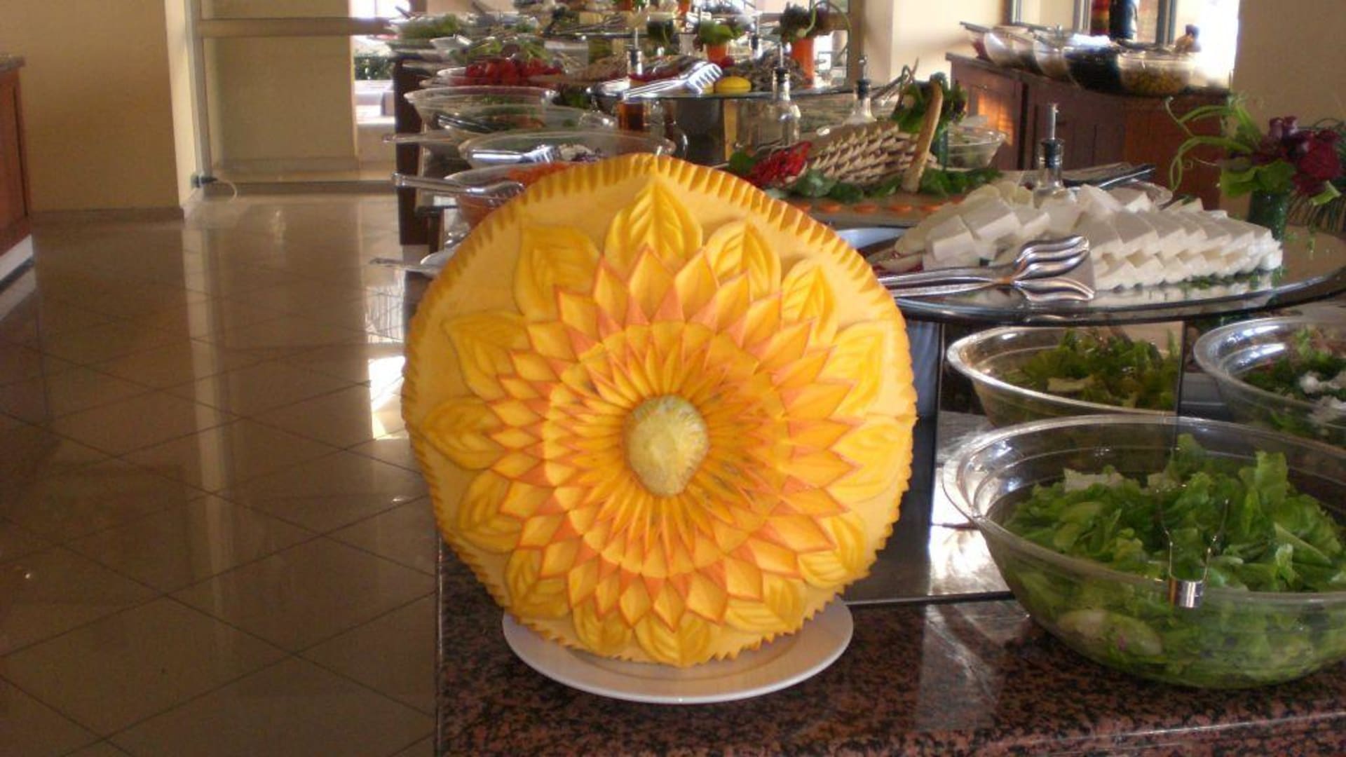 Kürbisdekuration zum Abendessen. Im Hintergrund befindet sich ein kleiner Teil des Buffet.