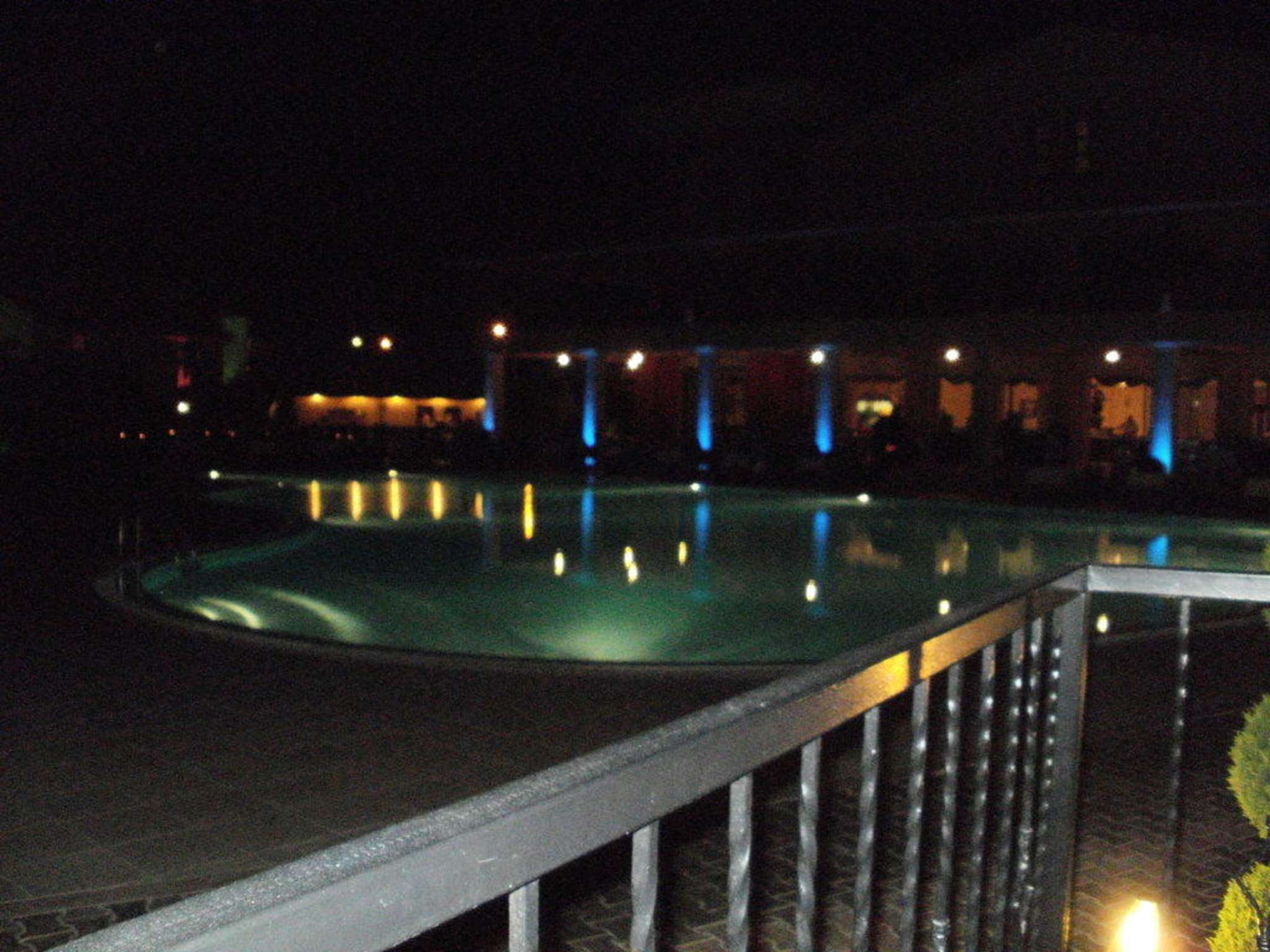 Victory Resort Ruhepool bei NachtSchöner Abendausblick auf den Ruhepool bei Nacht mit schöner Beleuchtung im Hintergrund Restaurant mit Hauptgebäude.