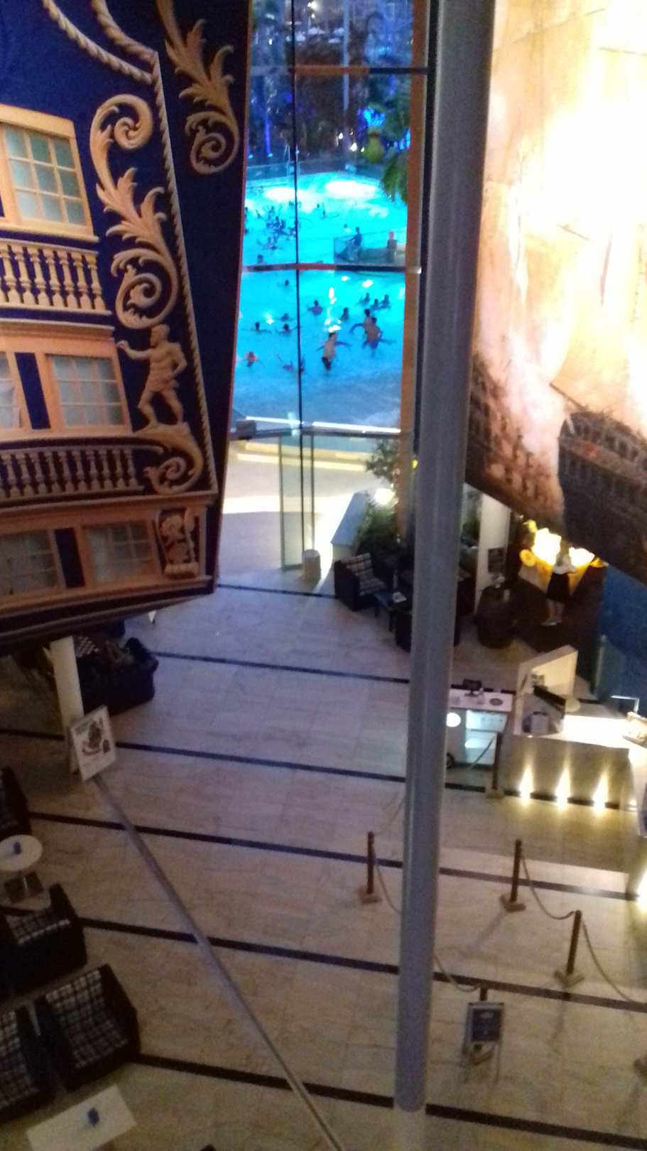 Ausblick vom 3. Stcok zur Rezeption unten und das dahinter liegende Wellenbecken