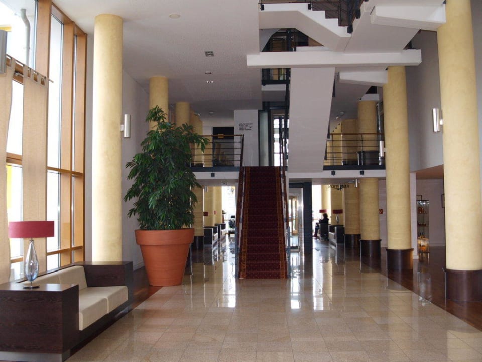 LobbyTreppe und dahinter der Fahrstuhl zu den anderen Etagen.