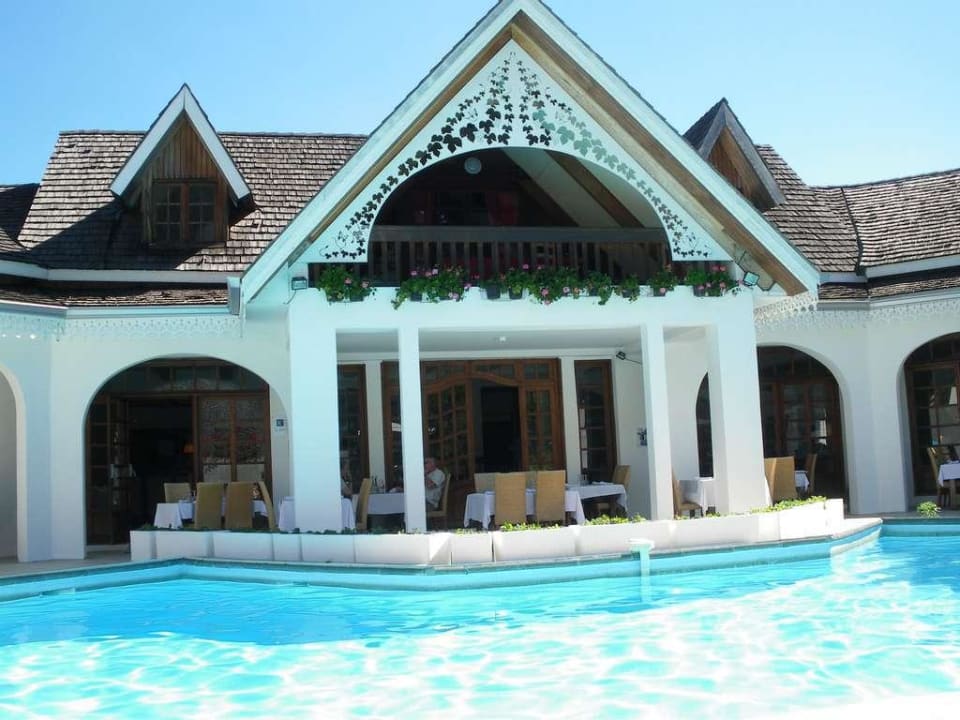Blick über den Pool zum Restaurant