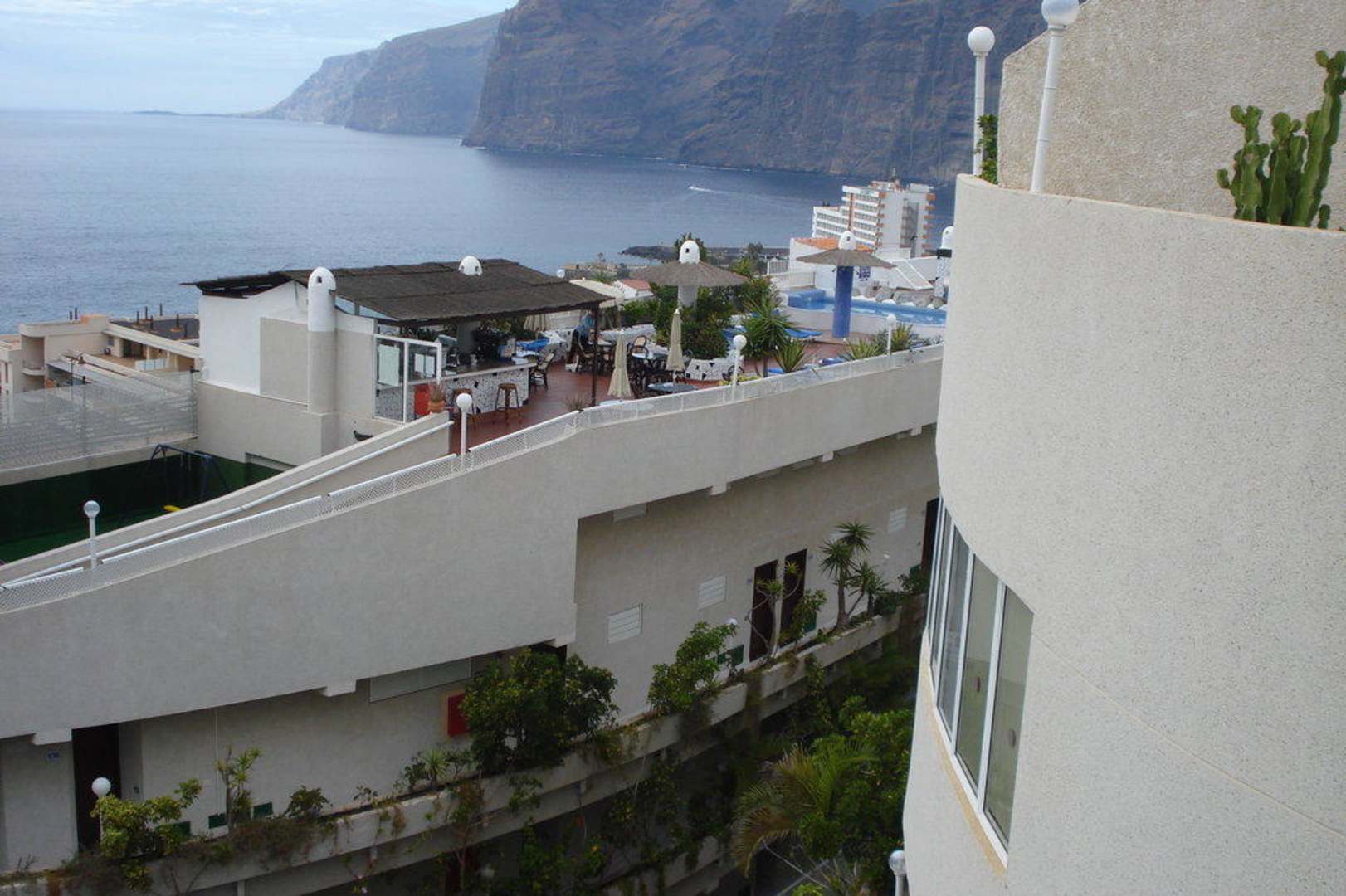 Blick zum oberen Pool mit Restaurant. Im Hintergraund Los Gigantes