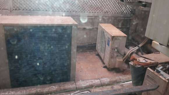 Blick aus dem Fenster. Laut und stickig durch die laufenden Geräte. Man konnte noch nicht mal Handtücher über das (rostige) Geländer hängen.