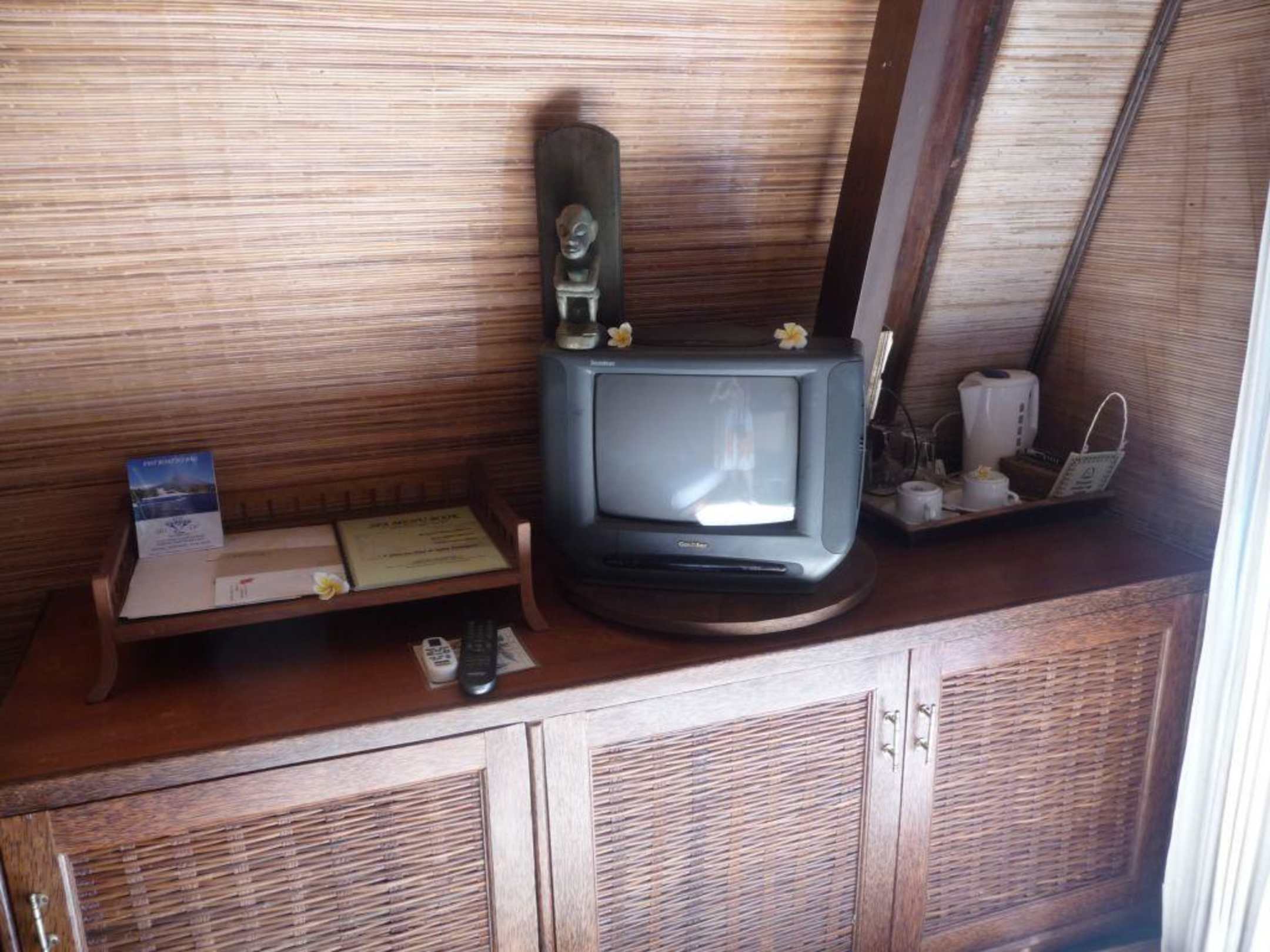 Die Unterschränke bieten Ablagefläche und genügend Platz für viele Utensilien. Hinter dem Fernseher steht das Tablett mit dem Wasserkocher und Tassen.