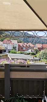 Ausblick von der Dachterrasse des Apartments ins Bodetahl