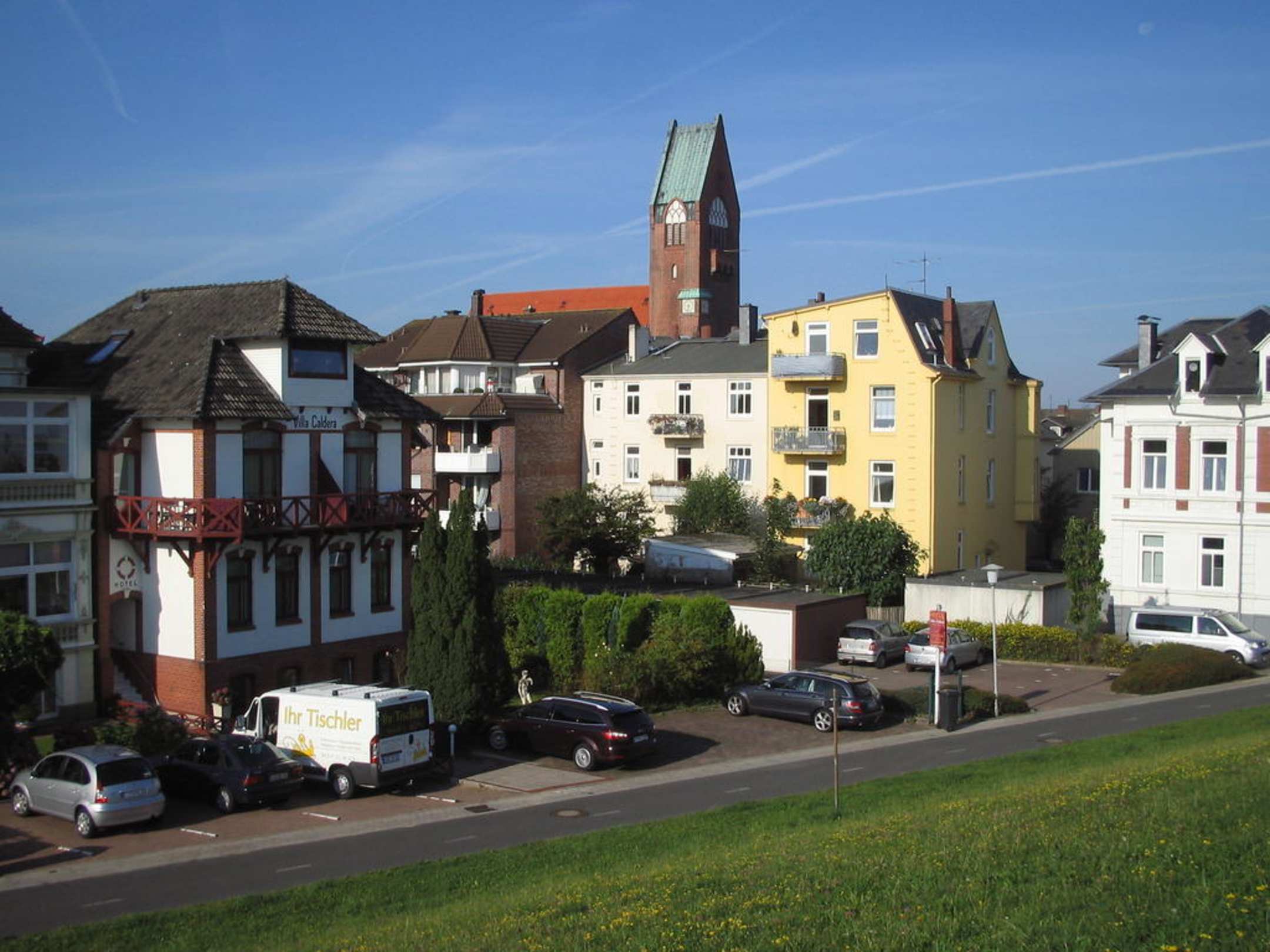 Die Villa Caldera ist links im Bild. Rechts die St. Petri Kirche.