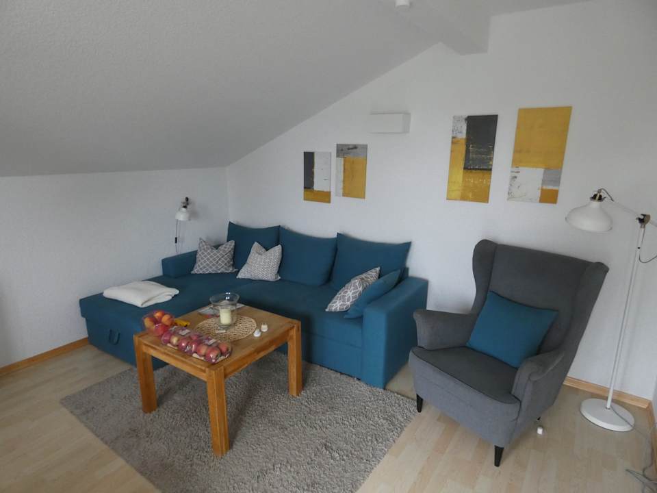 Die Sitzgruppe mit integrierter Schlafcouch im Wohnzimmer unseres Apartments