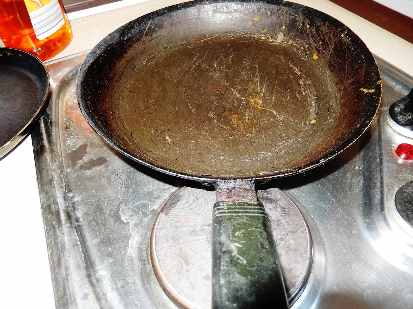 sehr alte Pfanne, Pfannenbelag abgenutzt, sehr stark verschmutzt