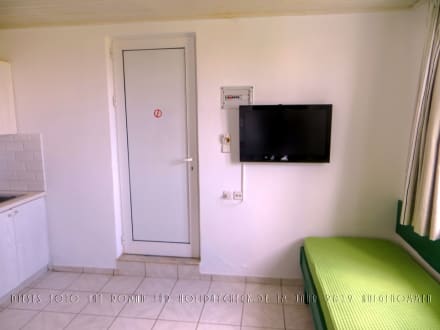 Tür des Zimmers 10 im Toilettenhäuschen mit hoher Stufe, abzuschließen mit dem Zimmerschlüssel. Flachbild-Fernseher an der Wand. Drittes, nicht benötigtes Bett. Vorhang am zweiten Fenster.