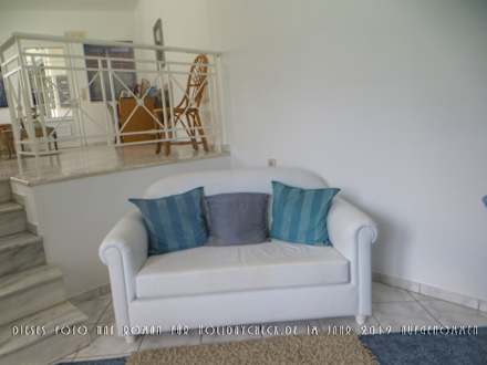 Ein Sofa gegenüber dem Schreibtisch an der Rezeption.