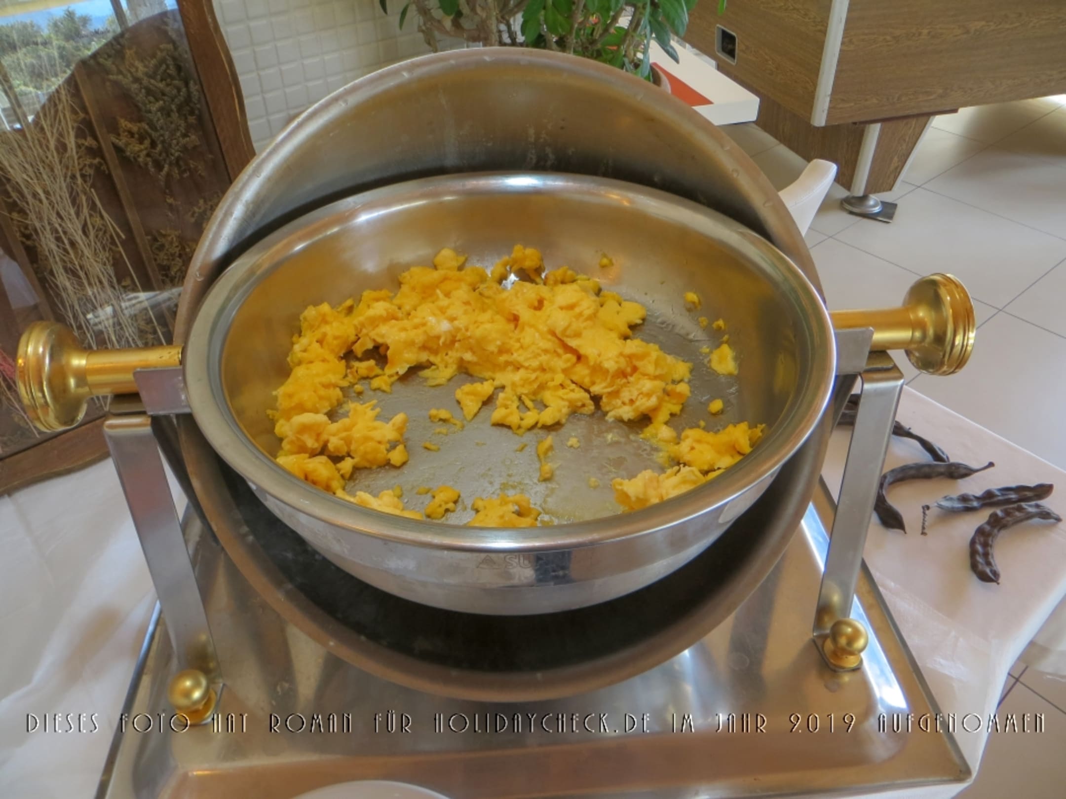 Ein Teil des Frühstücksbüffets. Rührei. Hatte einen ungewöhnlich hohen Anteil an Eierschalen..