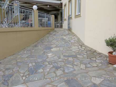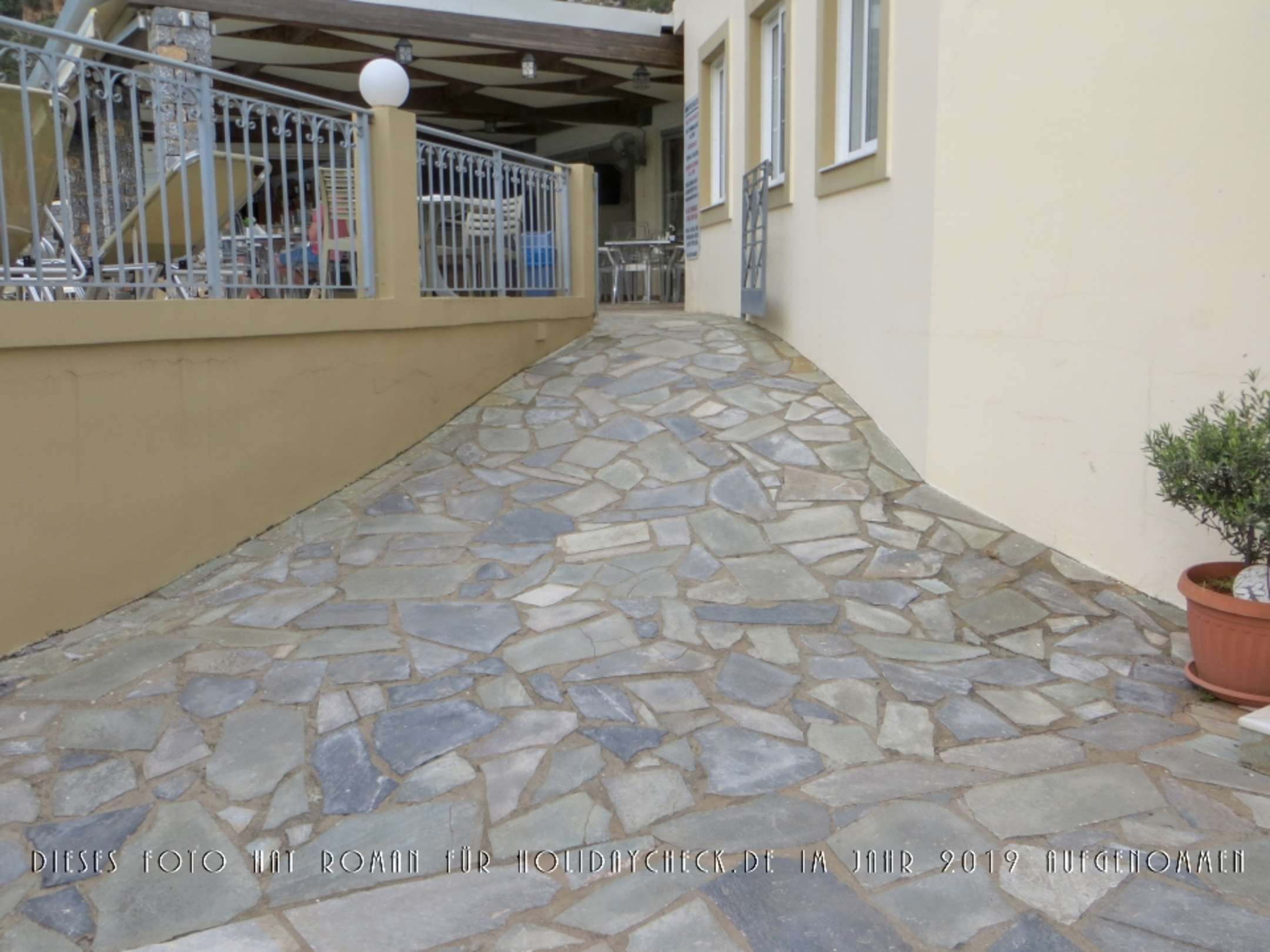 Der sich aufwärts immer weiter verengende Weg zur engen Pforte, die zum Pool, dem Bar-Bereich und dem Speisesaal führt. Diese Pforte ist nur während der Öffnungszeiten des Pools bzw. der Bar geöffnet.