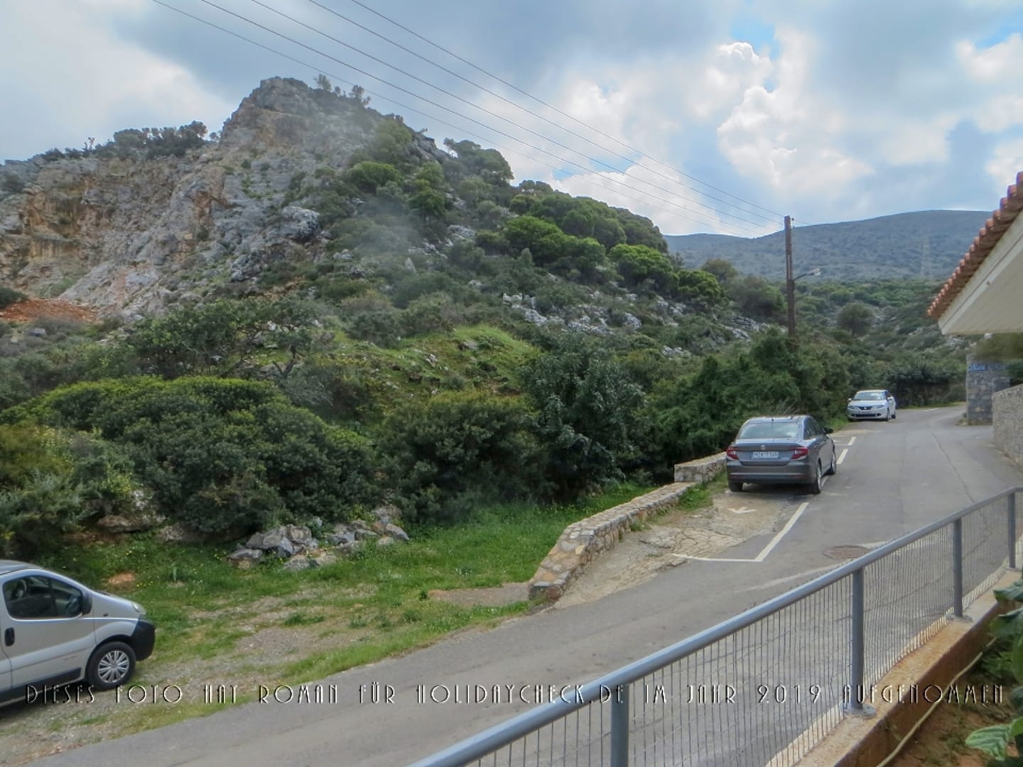 Bei der Terrasse von Zimmer 10 im Toilettenhäuschen Ausblick auf den Zaun der Hotelanlage, die vorbeiführende Straße und potentielle Auto-Abstellmöglichkeiten, vor der Kulisse der Berglandschaft.