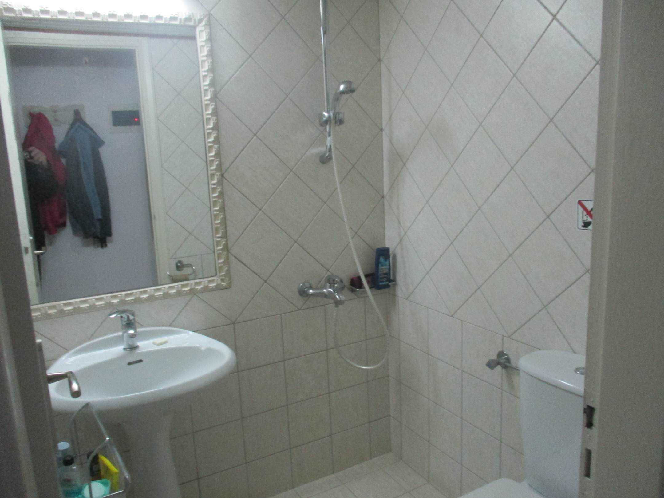 Unsere Mini Dusche leider ohne Duschwand oder Vorhang. Beim duschen spritzte das Wasser in alle Richtungen und Dampf wie in einer Waschküche. Es gab keinerlei Abluft Ventilation oder Heizung in diesem Raum