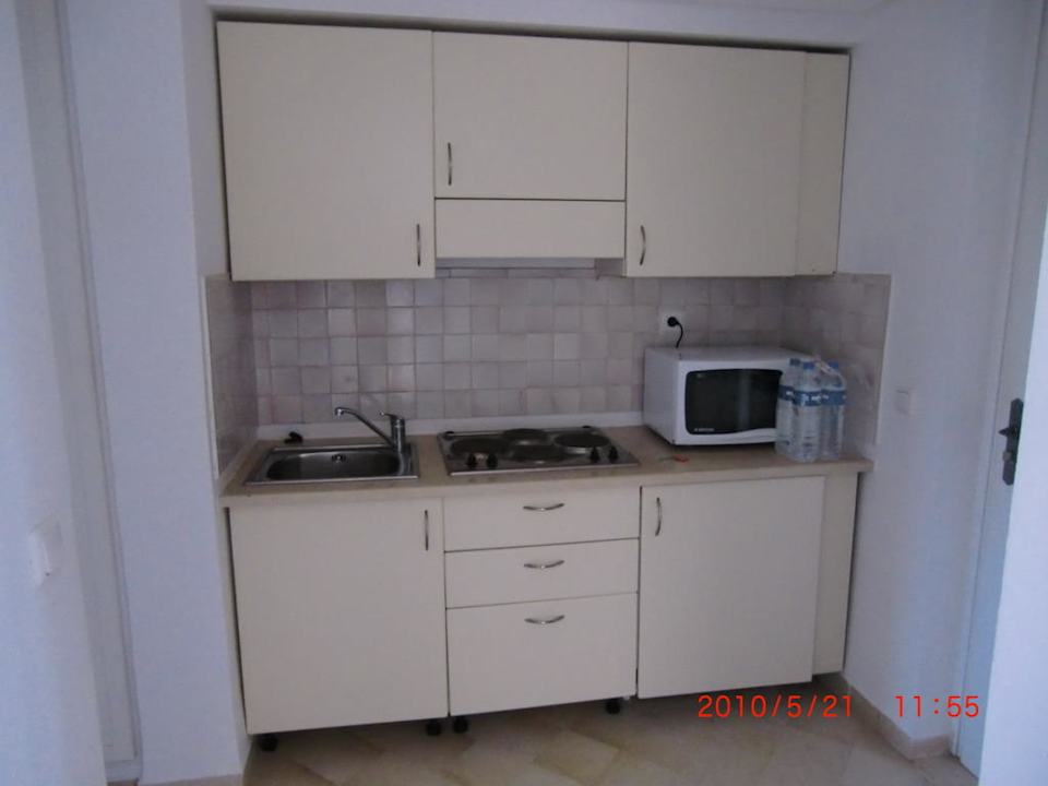 rechts steht die Mikrowelle auf dem gut kühlenden, einstellbaren Kühlschrank ohne Gefrierfach; mittig ein 4-Platten-Herd mit Kochinventar in den Schubladen; links Spülbecken mit Tellerfächer oben und Mülleimer unten.