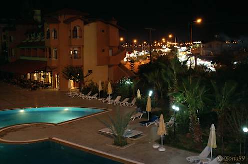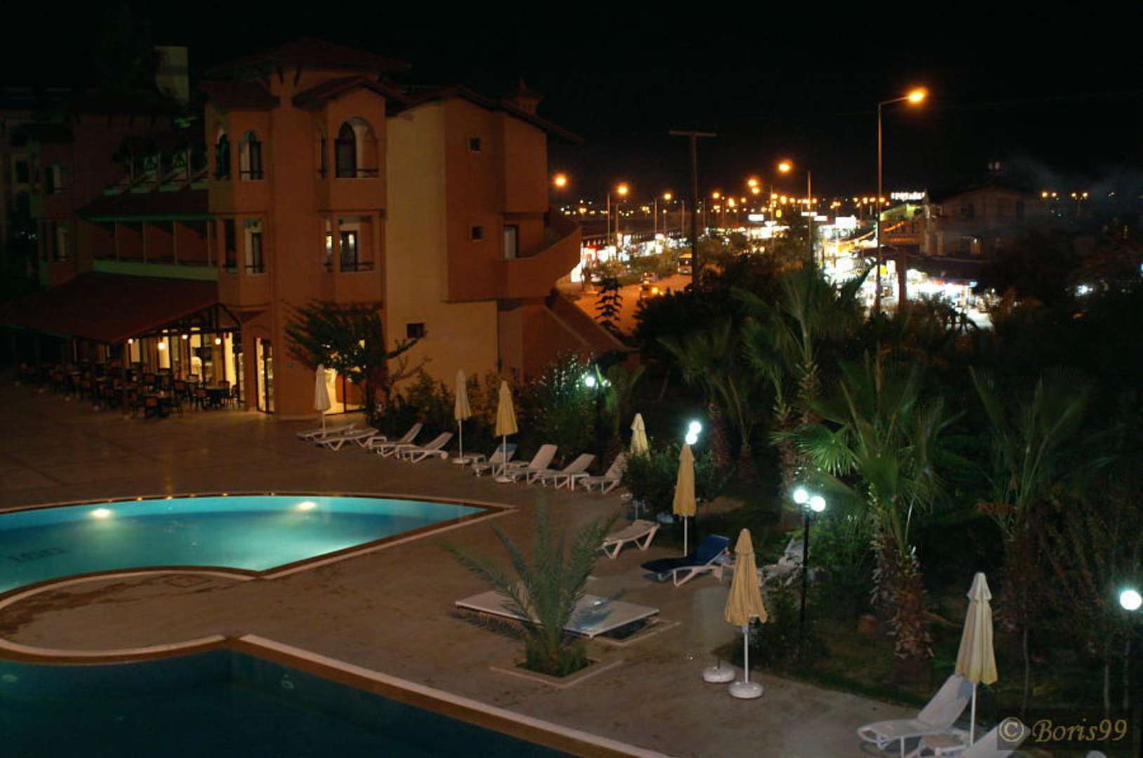 Blick aus dem BalkonEin abendlicher Blick aus dem Balkon im ersten Stock. Wir sehen hier den Pool und im Hintergrund die Einkaufsstrasse.